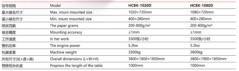 HCBK-1020/ 1080D自动单工位卡纸裱合机,底纸采用PLC控制的飞K达输送机,使输纸过程平稳准确,底纸上胶部根据不同纸张的要求,在不停机状态下来调整胶水涂布量,提高工作效率。